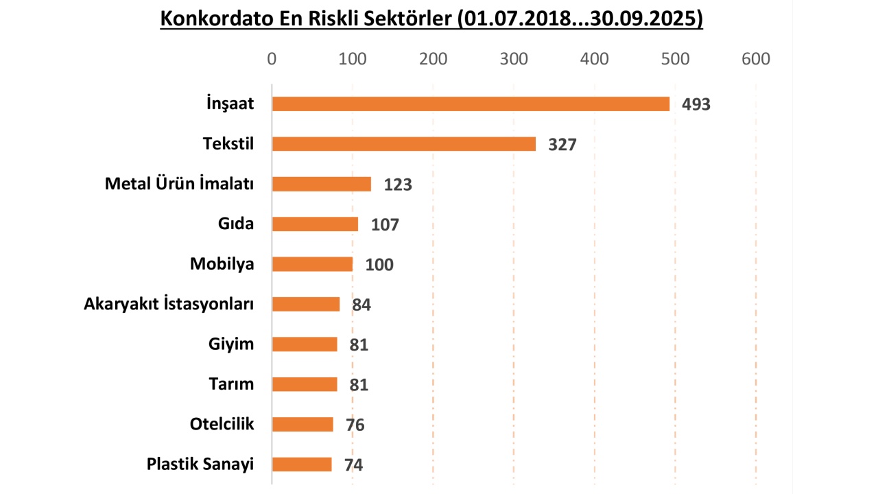 İnşaatı 327 firma ile tekstil sektörü izlerken, metal ürün imalatı (123), gıda (107) ve mobilya (100) sektörleri de konkordato riski taşıyan alanlar arasında yer aldı.