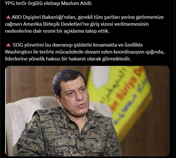 Mazlum Abdi, yaptığı açıklamada, “ABD Dışişleri Bakanlığı’ndan, gerekli tüm şartları yerine getirmemize rağmen Amerika Birleşik Devletleri’ne giriş vizesi verilmemesinin nedenlerine dair resmi bir açıklama talep ettik.” ifadelerini kullandı.